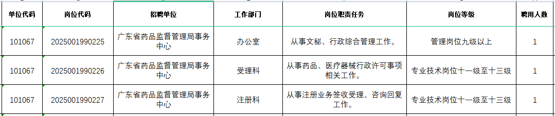 3个岗位,共计3人。岗位涉及文秘、行政综合管理,药品、医疗器械行政许可事项,注册业务签收受理、咨询回复等。